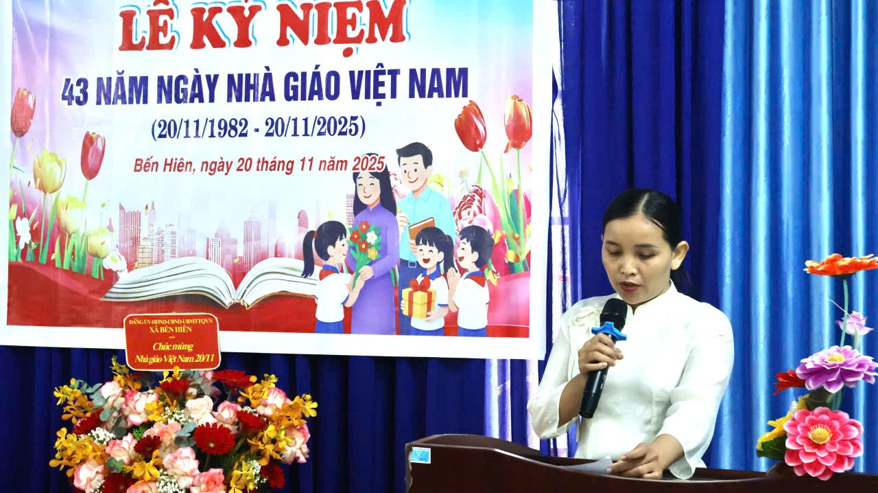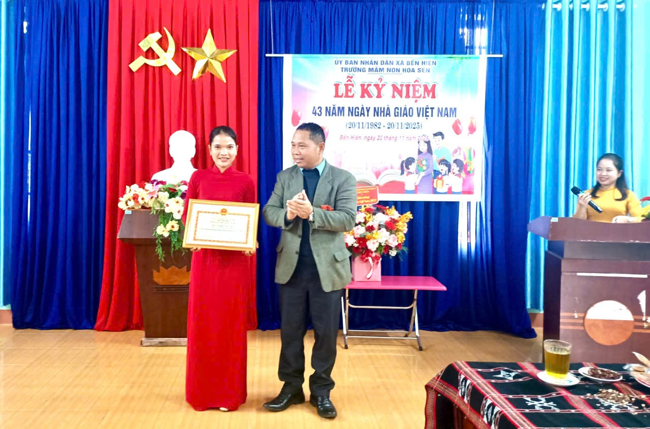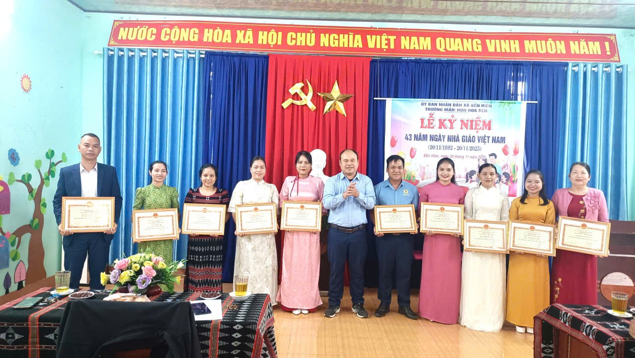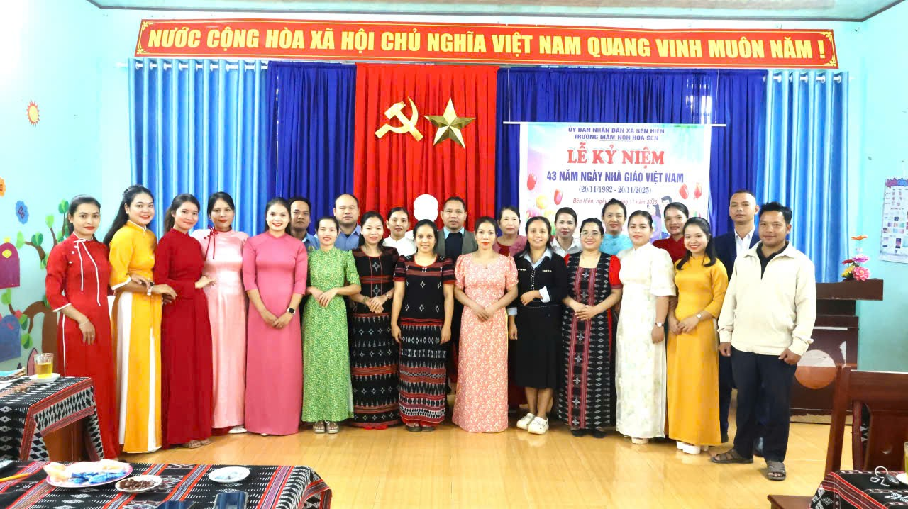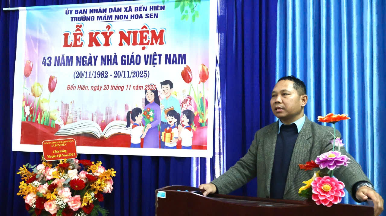 Sáng ngày 20/11, Trường Mầm non Hoa Sen, xã Bến Hiên long trọng tổ chức Lễ kỷ niệm 43 năm Ngày Nhà giáo Việt Nam (20/11/1982 - 20/11/2025). Đến dự có đồng chí Bhiryu Long, Phó Bí thư Đảng ủy, Chủ tịch UBND xã; đồng chí ALăng Lan, Trưởng phòng văn hóa - xã hội xã.