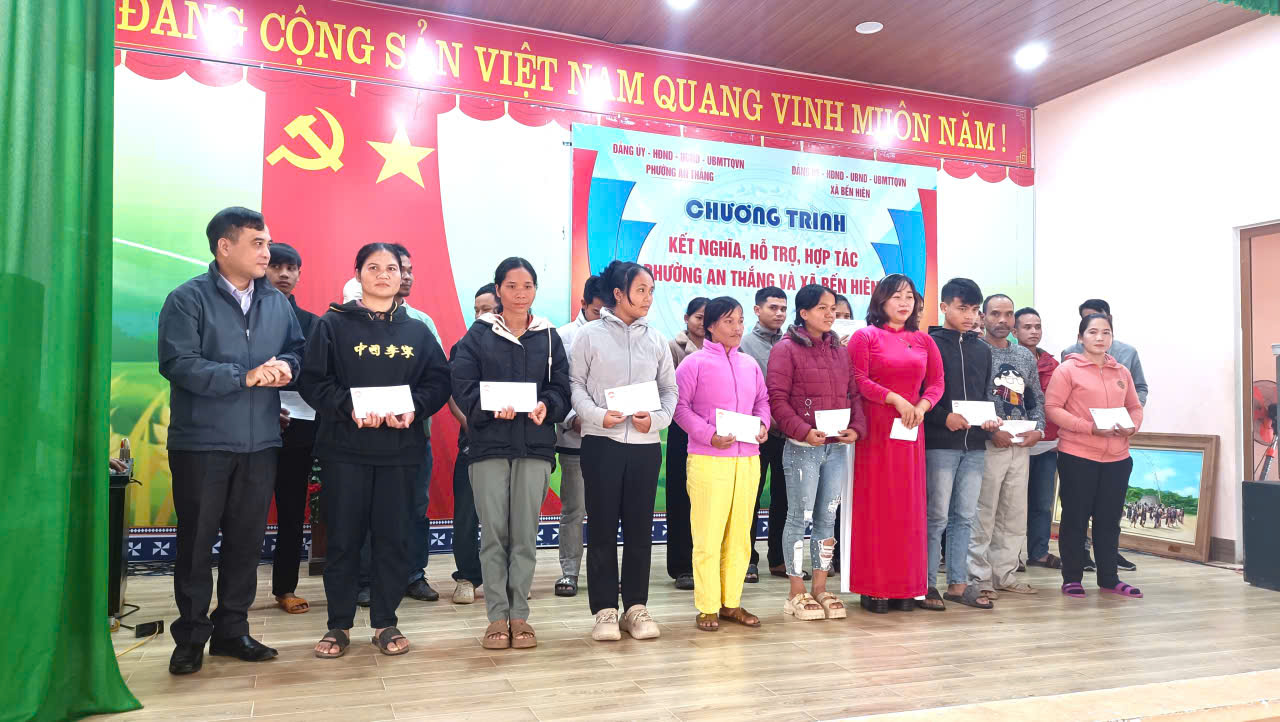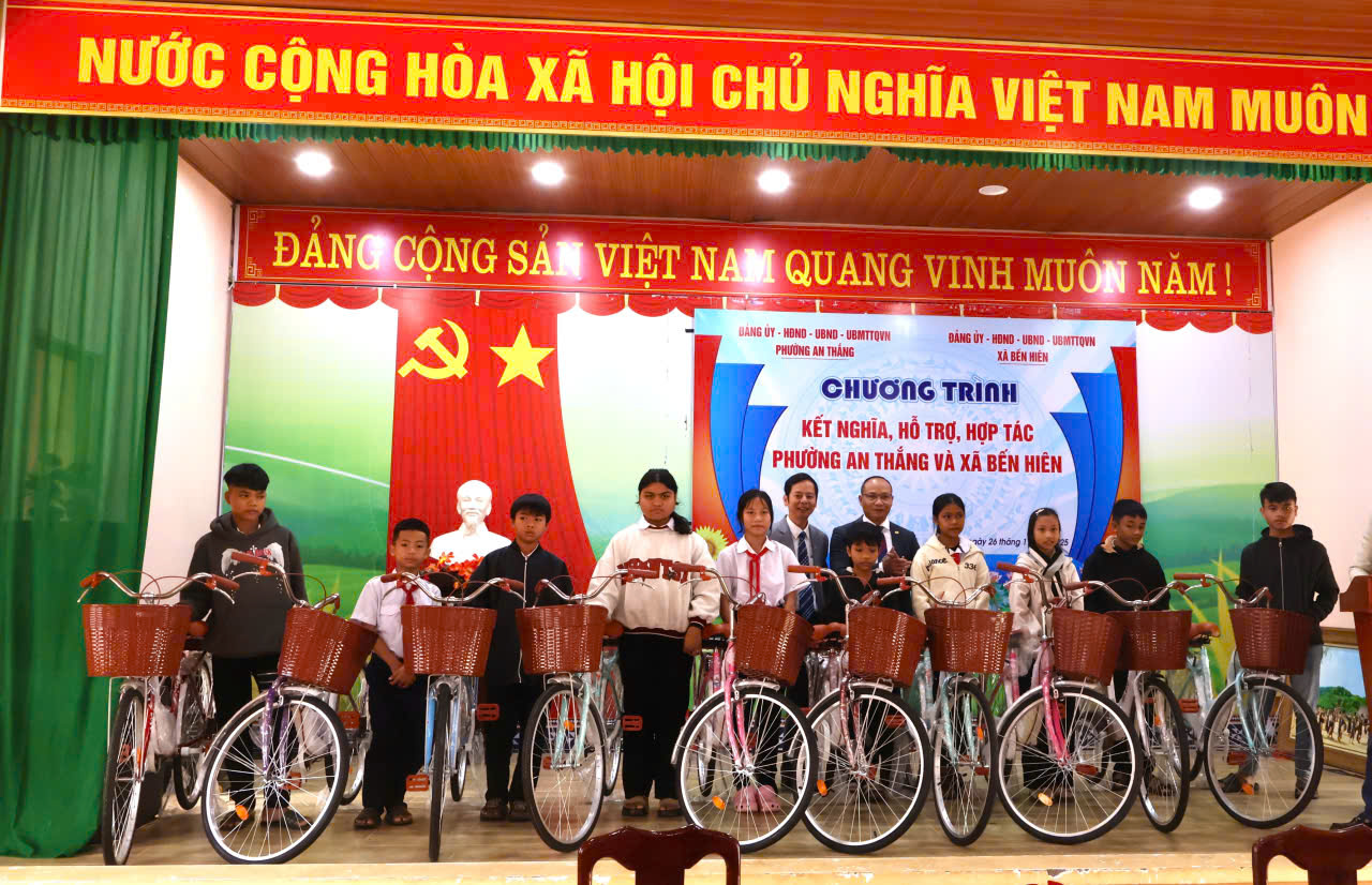 Dịp này, phường An Thắng trao 10 chiếc xe đạp cho học sinh nghèo vượt khó; Ủy ban MTTQ Việt Nam phường trao 20 suất quà cho học sinh có hoàn cảnh khó khăn; các trường học Phường An Thắng hỗ trợ 32 triệu đồng cho học sinh nghèo của xã Bến Hiên. Những món quà không chỉ mang giá trị vật chất mà còn là nguồn động viên tinh thần lớn lao, giúp các em thêm tự tin và nỗ lực vươn lên trong học tập và cuộc sống.