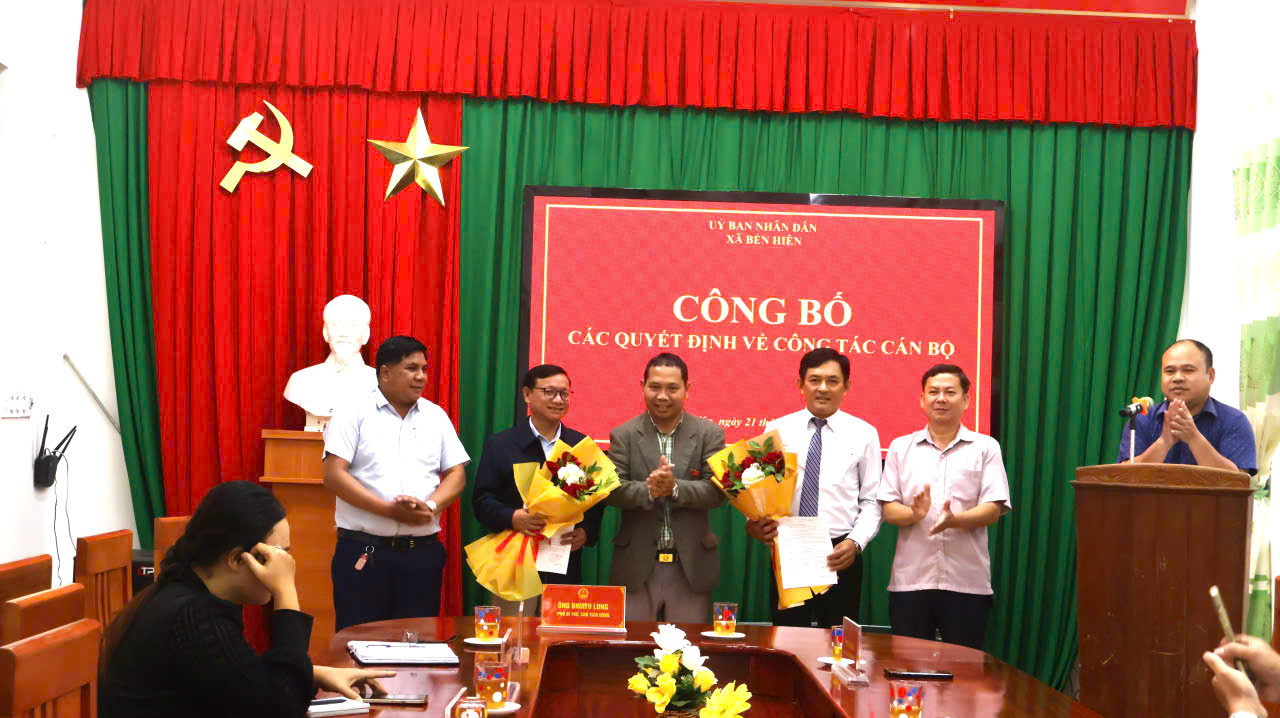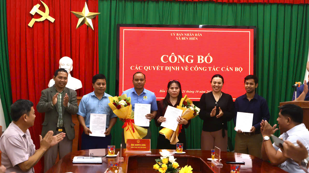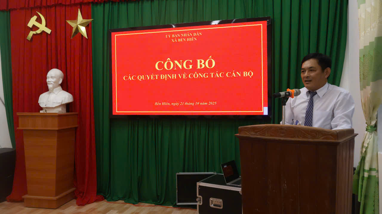 Chiều ngày 21/10/2025, UBND xã Bến Hiên tổ chức công bố các quyết định điều động và bổ nhiệm các chức danh cán bộ lãnh đạo; điều động, biệt phái công chức, viên chức của xã. Đồng chí Bhiryu Long, Phó Bí thư Đảng ủy, Chủ tịch UBND xã chủ trì. Tham dự hội nghị còn có đồng chí Trần Công Đức, Trưởng Ban xây dựng Đảng xã; đồng chí A Lăng Thị Trâm, PCT UBND xã; cùng các đồng chí lãnh đạo các phòng chuyên môn UBND xã.