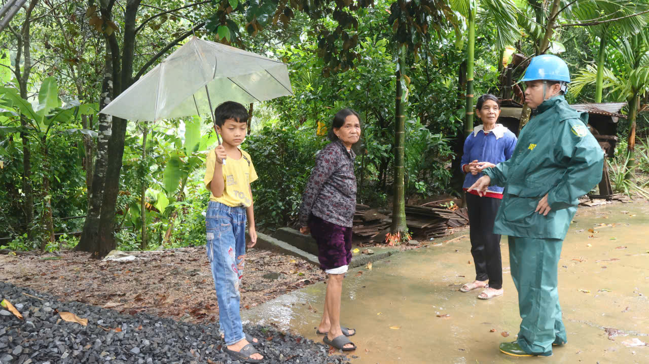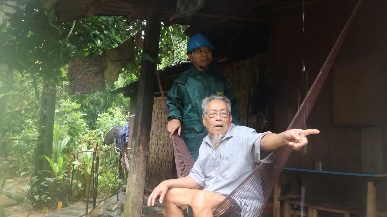 Ông Bhiryu Long, Chủ tịch UBND xã Bến Hiên, Trưởng BCH PCTT-TKCN xã, trao đổi với người dân. Ảnh: ATing Hàn