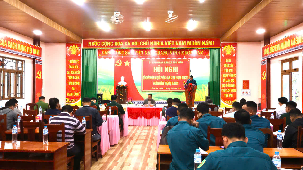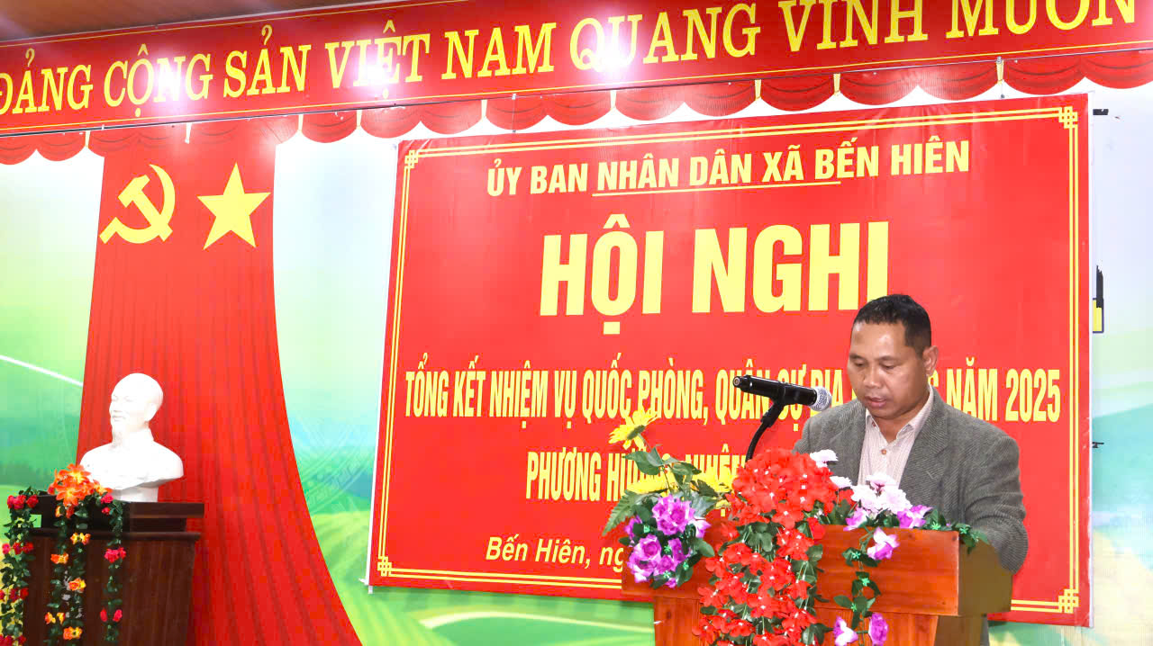 Chiều ngày 17/11, UBND xã Bến Hiên tổ chức hội nghị tổng kết nhiệm vụ  Quốc phòng quân sự địa phương năm 2025 và triển khai phương hướng, nhiệm vụ năm 2026. Đến tham dự hội nghị, có đồng chí Thượng tá Nguyễn Phước Trung, Phó Chỉ huy trưởng Ban Chỉ huy phòng thủ khu vực 2 – Thạnh Mỹ; Trung tá Nguyễn Thành Nam, Chủ  nhiệm chính trị Ban Chỉ huy phòng thủ khu vực 2 – Thạnh Mỹ; đồng chí Đinh Thị Thuý Hồng, Phó Bí thư Thường trực Đảng uỷ; lãnh đạo Thường trực Đảng uỷ, HĐND, UBND, UBMTTQVN xã; đại diện lãnh đạo Ban xây dựng Đảng, văn phòng Đảng uỷ, Uỷ ban kiểm tra Đảng; lãnh đạo các ban, ngành, Mặt trận, đoàn thể, tổ chức chính trị - xã hội; Bí thư chi bộ, Trưởng thôn, thôn đội trưởng của 6 thôn. Đồng chí Bhiryu Long – Phó Bí thư Đảng uỷ, Chủ tịch UBND xã chủ trì hội nghị.