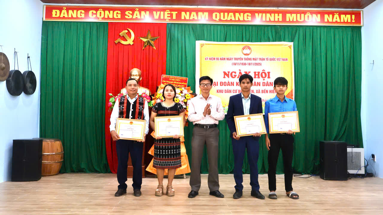 Đồng chí Dương Văn Chung, ĐUV, Phó Chủ tịch UBND xã, tặng giấy khen cho các hộ gia đình đạt danh hiệu gia đình Văn hóa tiểu biểu năm 2025 nhân dịp Ngày hội đại đoàn kết toàn dân tộc khu dân cư thôn Bến Hiên, xã Bến Hiên. Ảnh: ATing Hàn