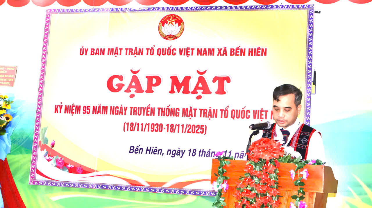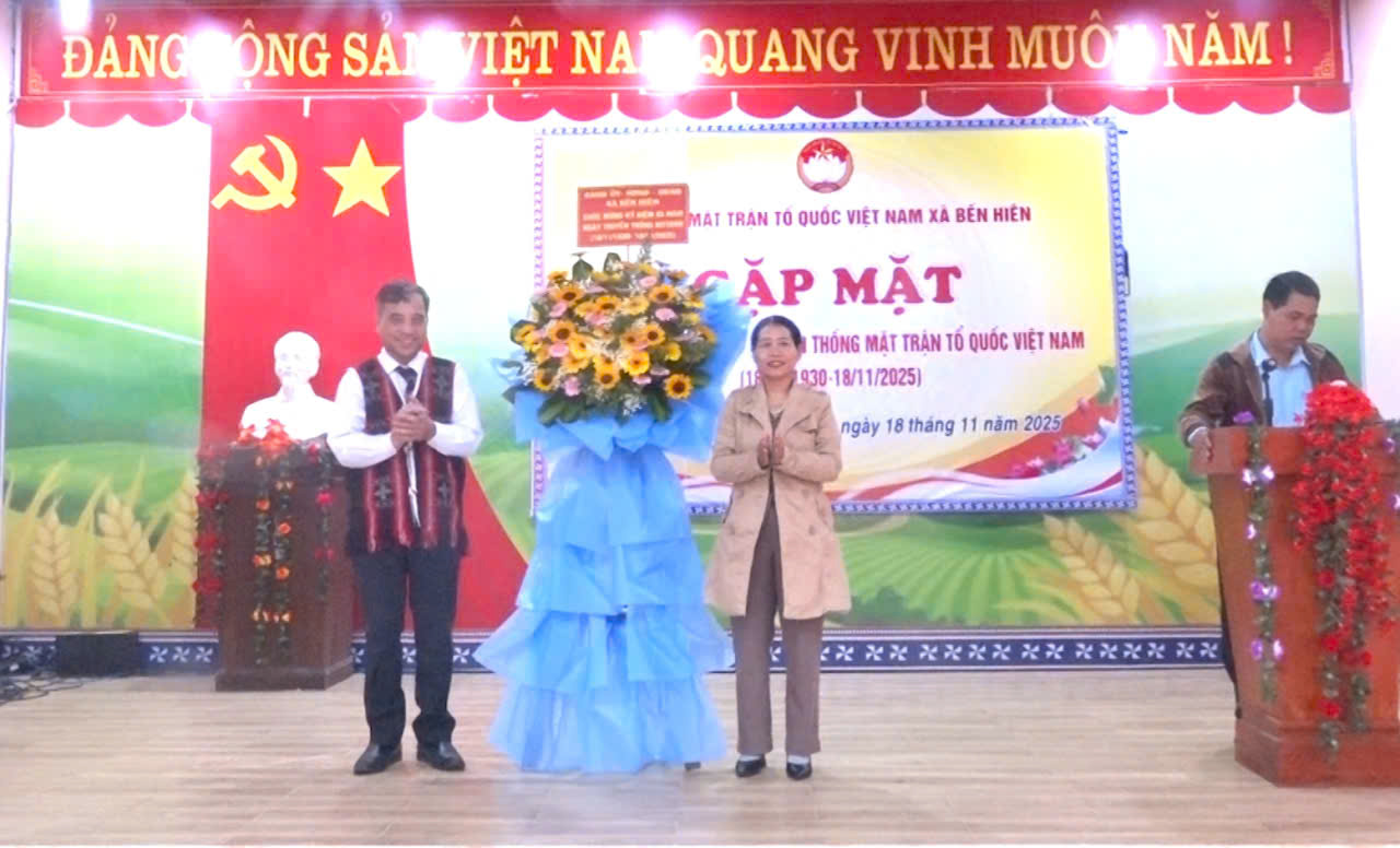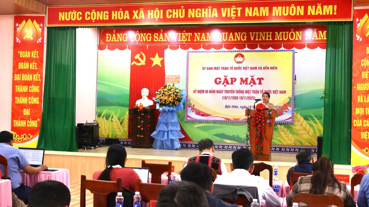 Sáng ngày 18/11, Uỷ ban MTTQ Việt Nam xã Bến Hiên tổ chức gặp mặt kỷ niệm 95 năm Ngày truyền thống Mặt trận Tổ quốc Việt Nam (18/11/1930-18/11/2025). Tham dự có đồng chí Đinh Thị Thuý Hồng, Phó Bí thư Thường trực Đảng uỷ xã; đại diện lãnh đạo Đảng uỷ, HĐND, UBND, UBMTTQVN xã; đại diện lãnh đạo các ban, ngành, đoàn thể, Tổ chức chính trị - xã hội xã; các vị nguyên lãnh đạo Uỷ ban MTTQ Việt Nam xã qua các thời kỳ; Bí thư chi bộ, Trưởng thôn, Trưởng ban công tác Mặt trận 6 thôn.